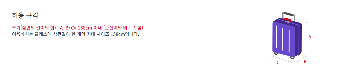 | 성인/소아 (국내선) | 무게: 15kg (33lbs) 이내 크기: 삼변의 합 203cm 이내 |
