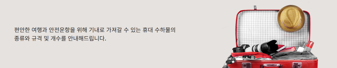 유의사항 휴대 수하물 반입 규정을 초과(무게, 사이즈 또는 개수)하는 모든 수하물은 반드시 수속 카운터에서 미리 위탁하시기 바랍니다.