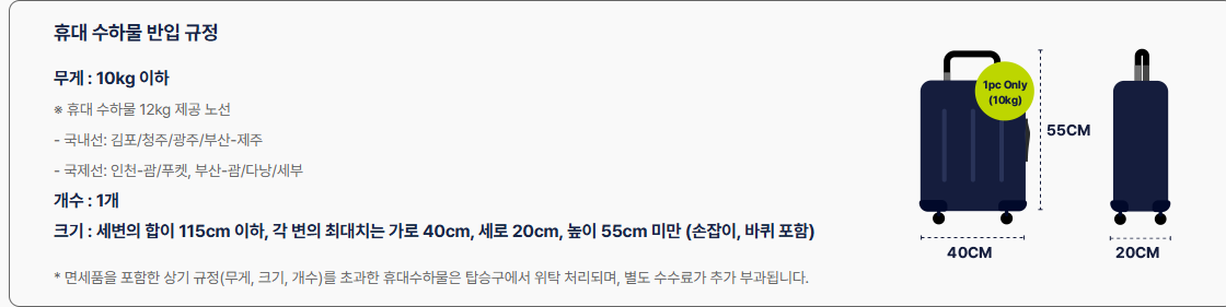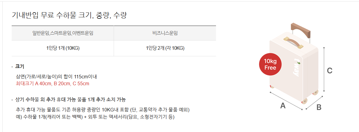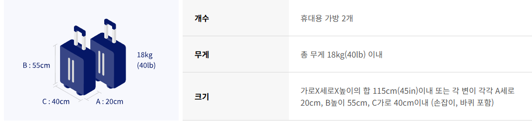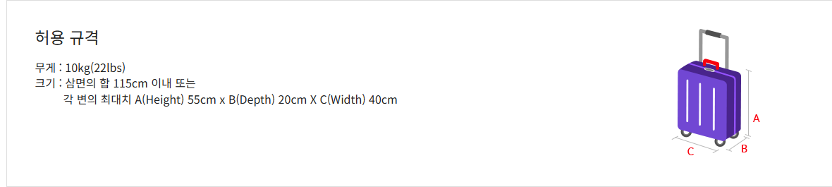 • 크기: 휴대수하물: 삼변의 합 115cm 이내 (한변 최대 55cm)
