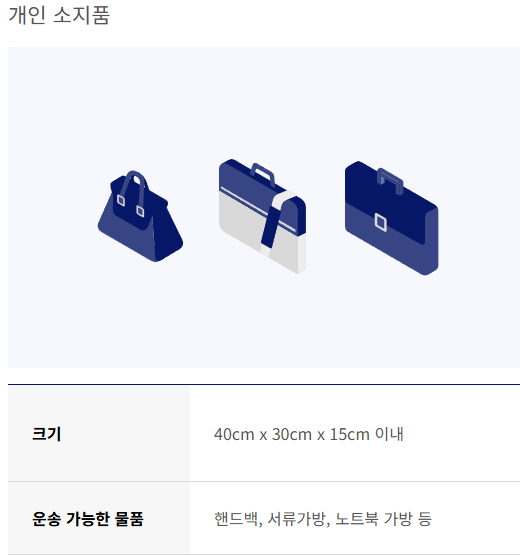 개인소지품: 노트북, 핸드백, 면세품 등 (40cm x 30cm x 15cm 이내)
